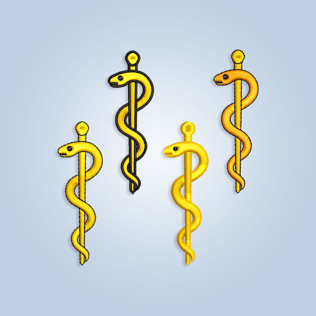 Bundle of Rod Of Asclepius Embroidery design files for machine embroidery. Formats pes, csd, dst, exp, hus, jef, sew, xxx, vp3. Sizes 1″ 2″ 3″ 4″ 5″ 6″ 7″ 8″ 9″ 10″