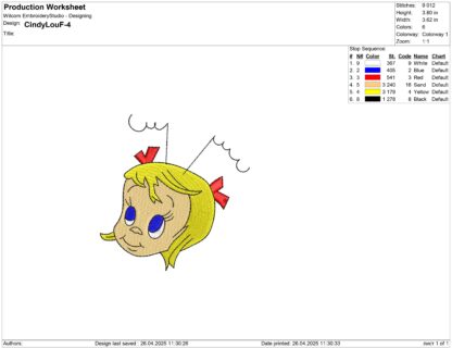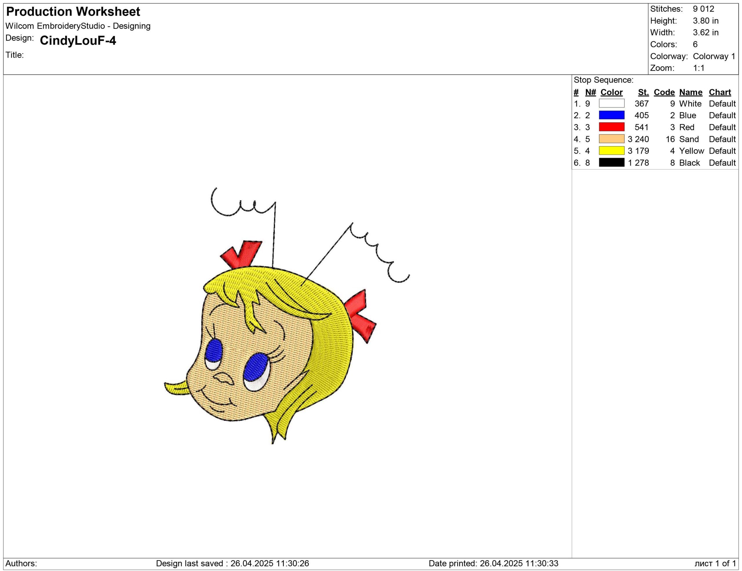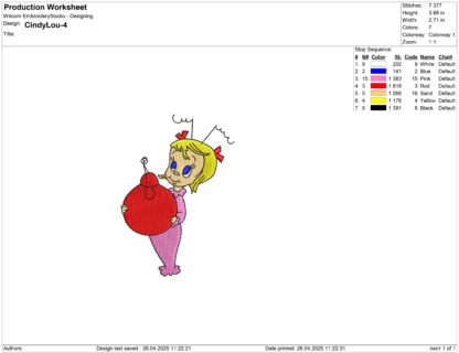 Cindy Lou embroidery design files for machine embroidery. Formats pes, csd, dst, exp, hus, jef, sew, xxx, vp3, u?? Sizes 1.5″ 2″ 3″ 4″ 5″ 6″ 7″ 8″