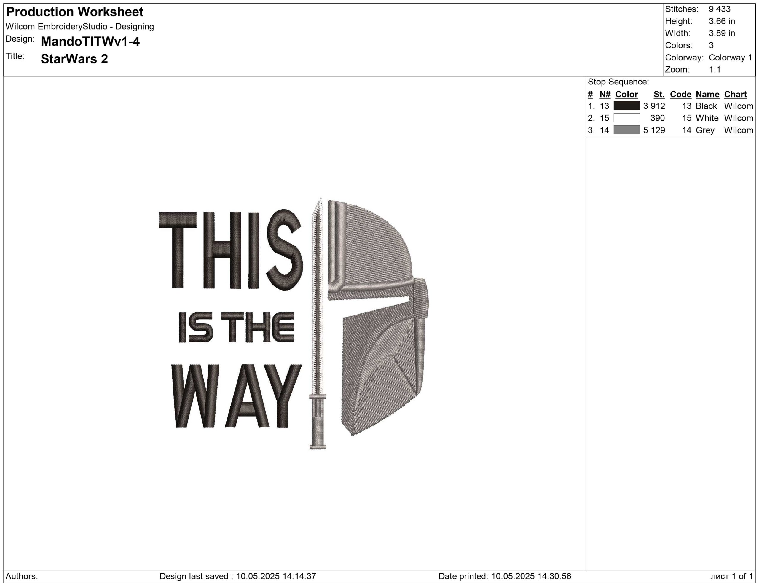 Mandalorian This is The Way Embroidery design files for embroidery machine. Formats pes, csd, dst, exp, hus, jef, sew, xxx, vp3. Sizes: 2″ 3″ 4″ 5″ 6″ 7″ 8″